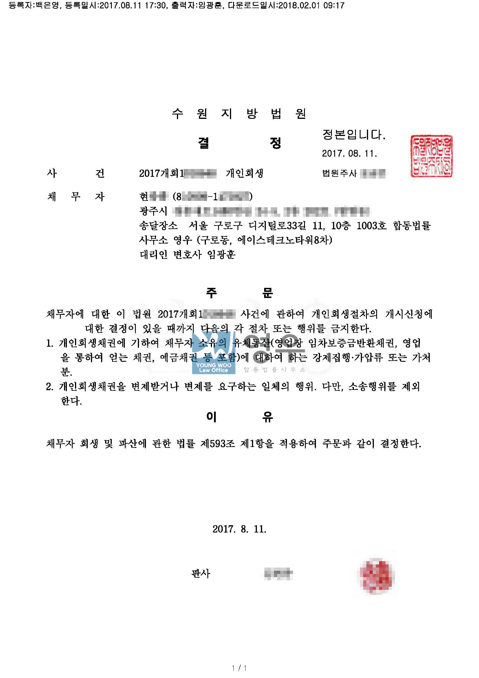 법무법인 영우는 신청서 접수부터 사건의 진행까지 무자격 브로커가 아닌 담당 변호사가 직접 수행합니다. 특히 회생·파산 관련 사건은 진행부터 사후관리까지 철저하게 관리하지 않으면 다시 기각될 가능성이 높기 때문에 경험이 많은 변호사의 도움을 받아 진행하는 것이 안전합니다.
