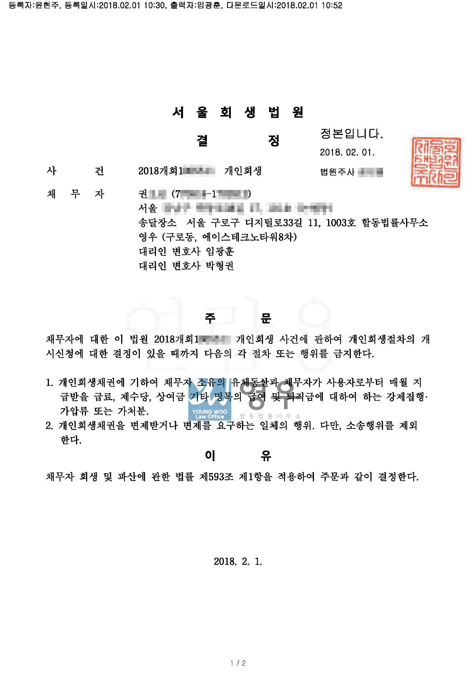 법무법인 영우는 신청서 접수부터 사건의 진행까지 무자격 브로커가 아닌 담당 변호사가 직접 수행합니다. 특히 회생·파산 관련 사건은 진행부터 사후관리까지 철저하게 관리하지 않으면 다시 기각될 가능성이 높기 때문에 경험이 많은 변호사의 도움을 받아 진행하는 것이 안전합니다.