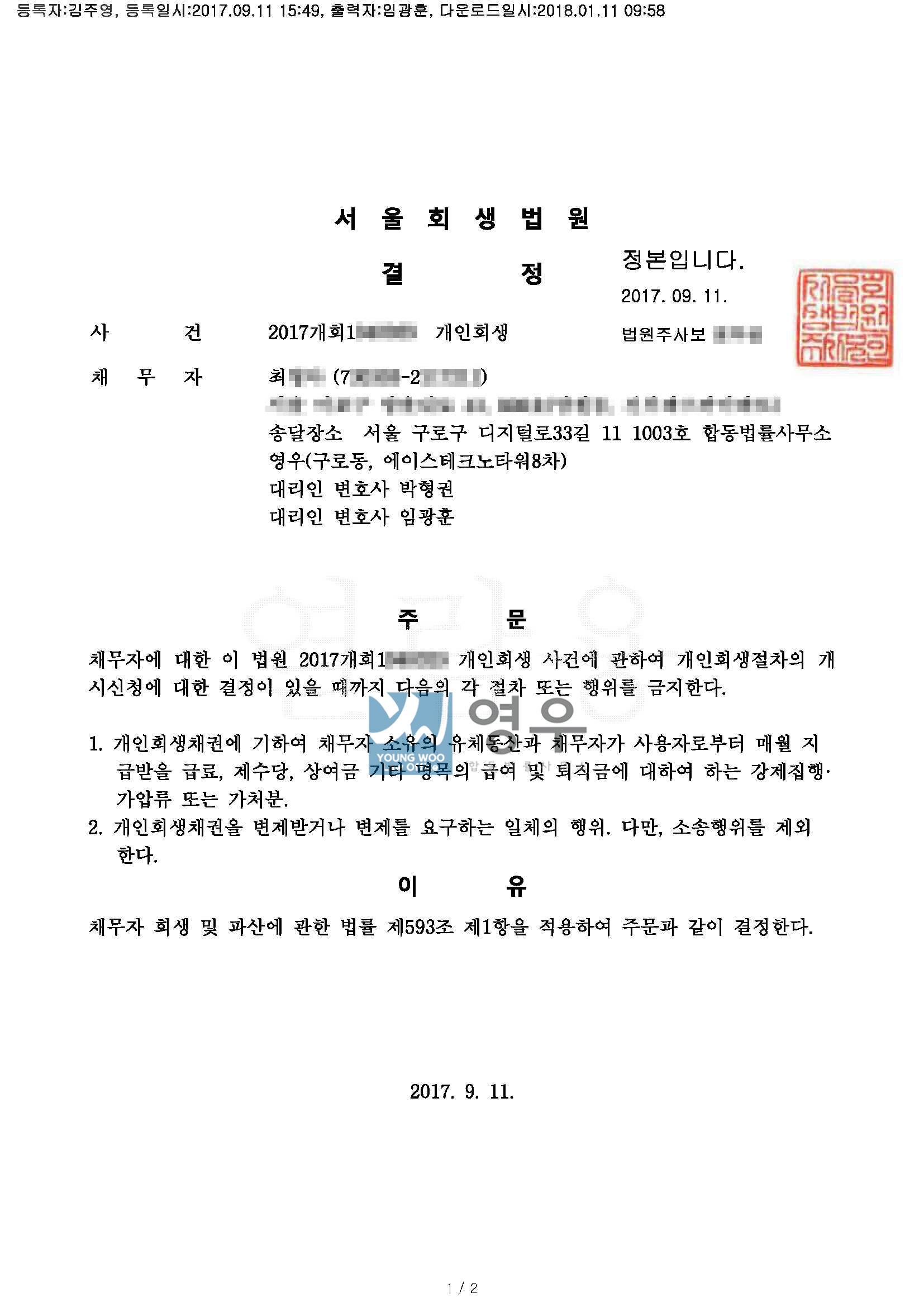 [서울회생법원] 개시신청 후 3일만에 금지명령 결정 빚독촉 방어성공