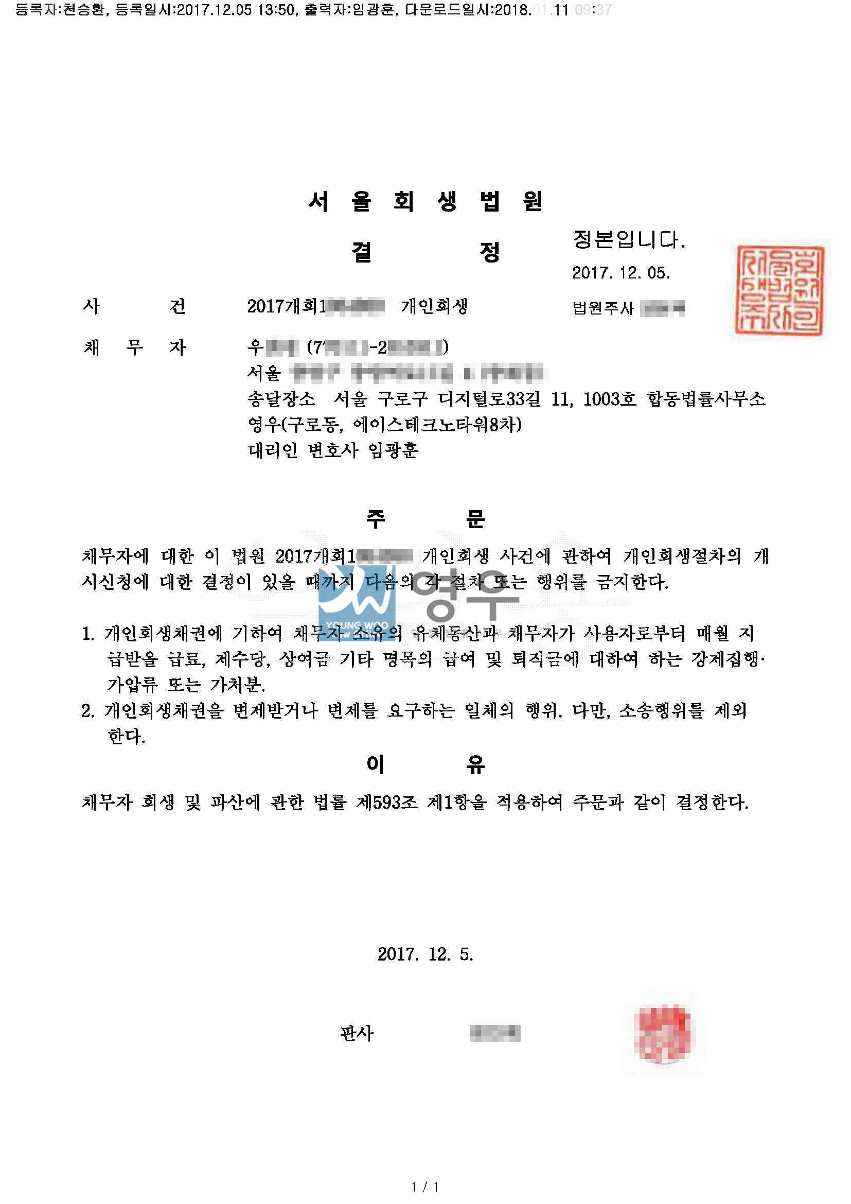 [서울회생법원] 5천만원 채무 빚독촉 금지명령 5일만에 성공