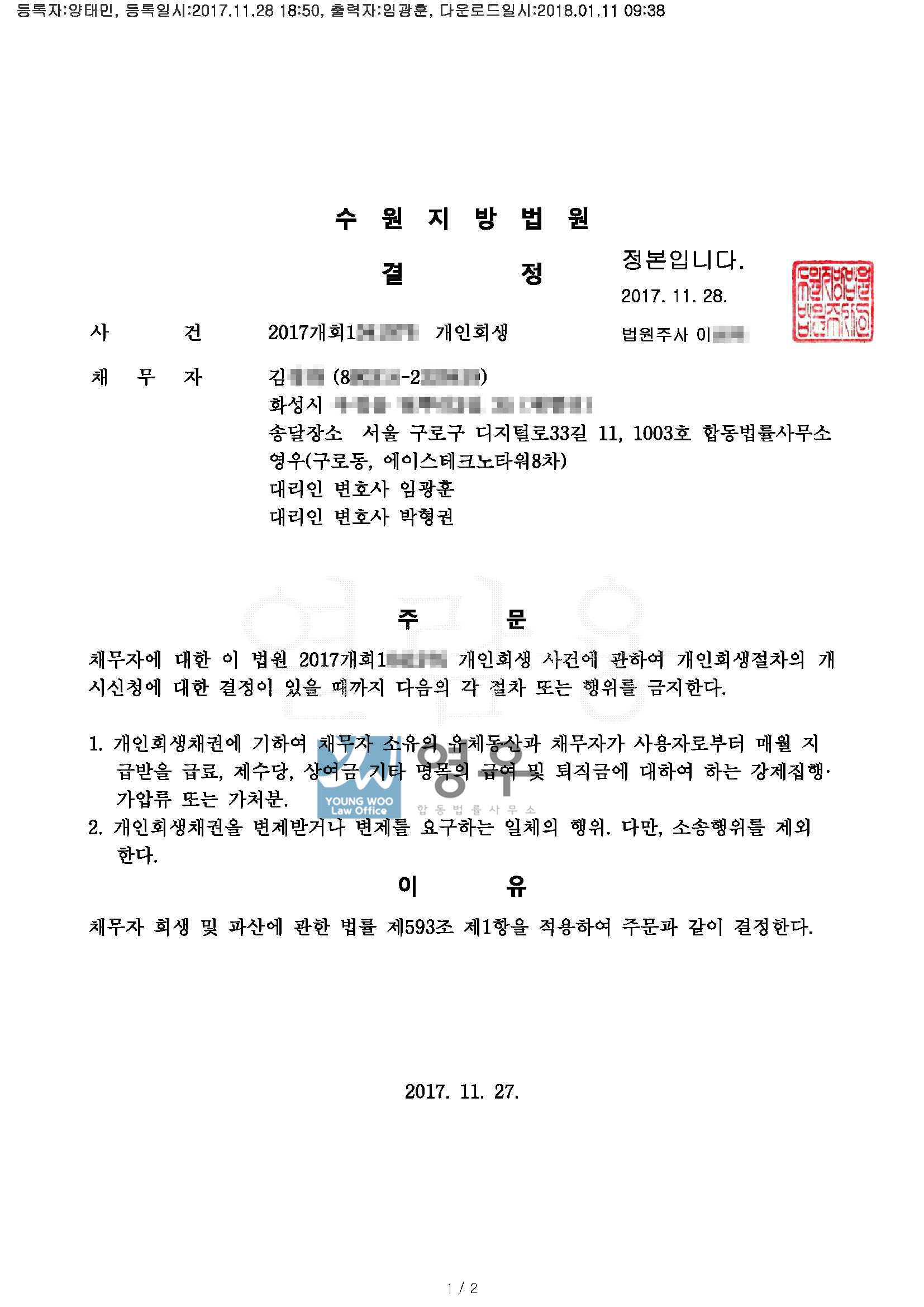법무법인 영우는 신청서 접수부터 사건의 진행까지 무자격 브로커가 아닌 담당 변호사가 직접 수행합니다. 특히 회생·파산 관련 사건은 진행부터 사후관리까지 철저하게 관리하지 않으면 다시 기각될 가능성이 높기 때문에 경험이 많은 변호사의 도움을 받아 진행하는 것이 안전합니다.